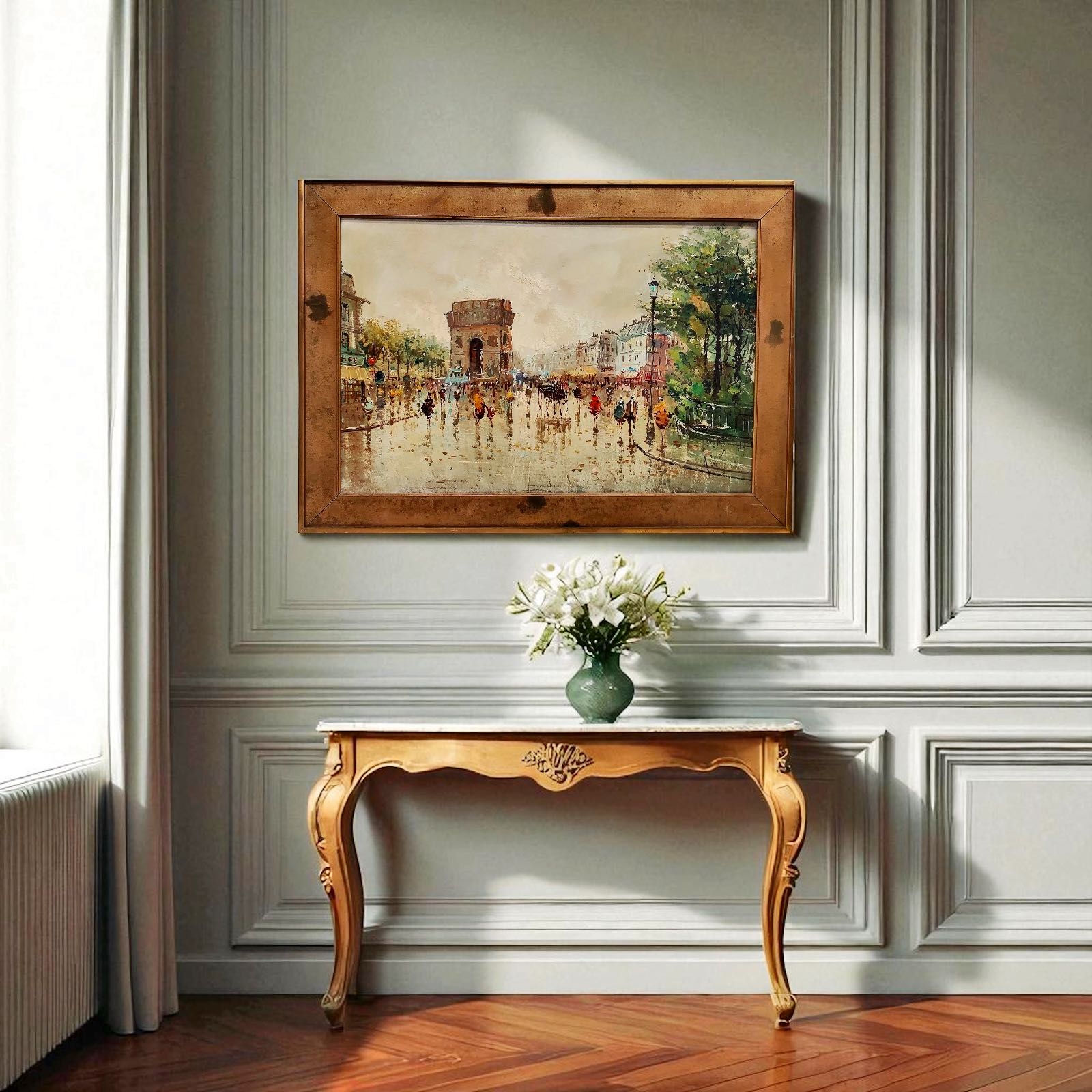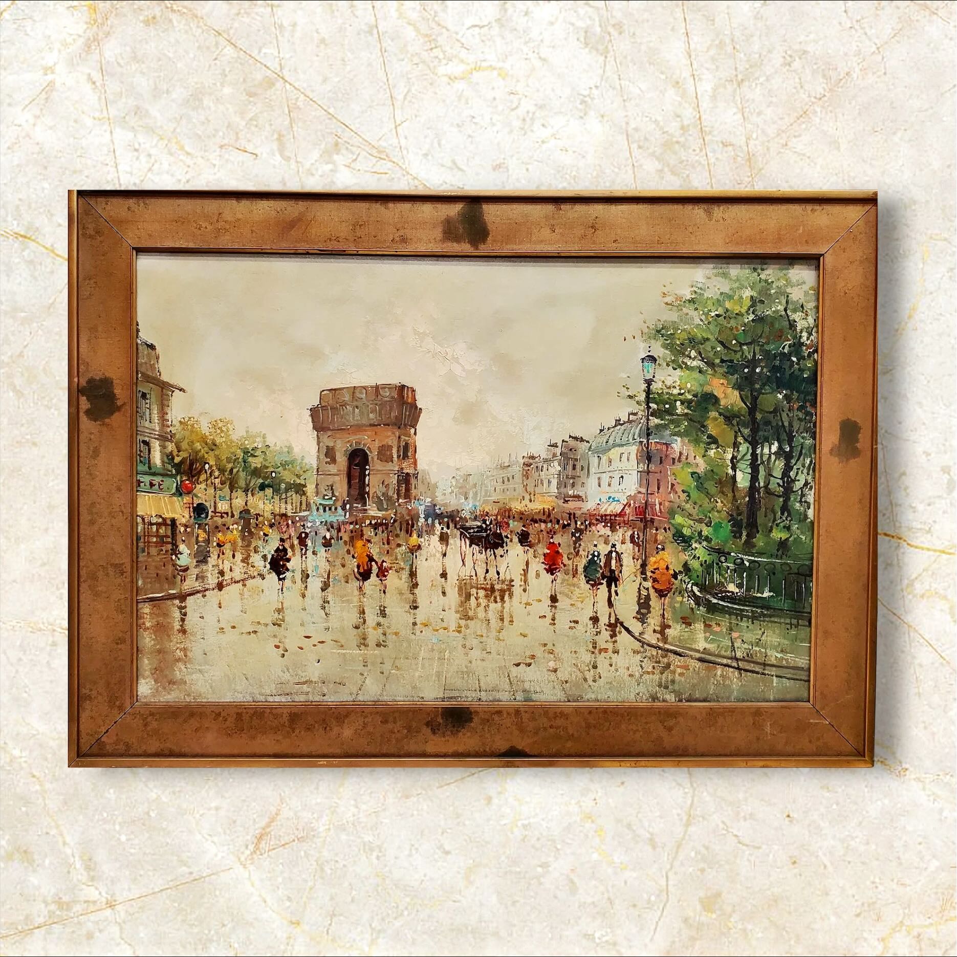 Step into the poetic charm of Paris with this stunning original oil painting by celebrated French-Italian Impressionist Professor Anthony DeVity. Depicting a rainy day along the grand boulevard leading to the Arc de Triomphe, DeVity masterfully captures the movement of a bustling city beneath soft gray skies. The shimmering reflections on the wet cobblestones, the elegance of horse-drawn carriages, and the vibrant parade of umbrellas bring this iconic scene to life with energy and grace.