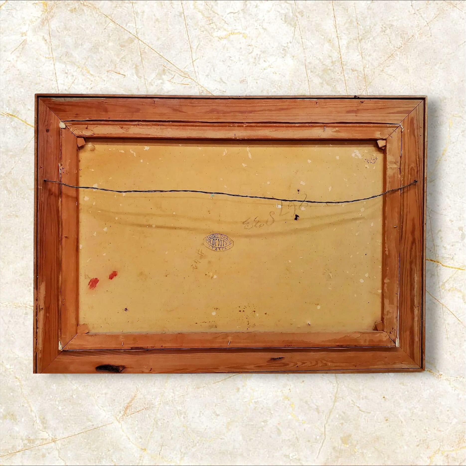 Signed in the lower right corner and stamped on the verso, this one-of-a-kind piece is set in a warm, vintage gilt frame that enhances its nostalgic ambiance. A timeless tribute to the beauty of European city life, “Paris in the Rain” is a captivating addition to any refined interior.